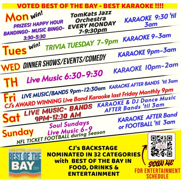 It wouldn’t be CJ’s without the entertainment. Join us 7 days a week for karaoke, including CJ’s famous live band karaoke! From trivia night, to live music- we’re always having fun!